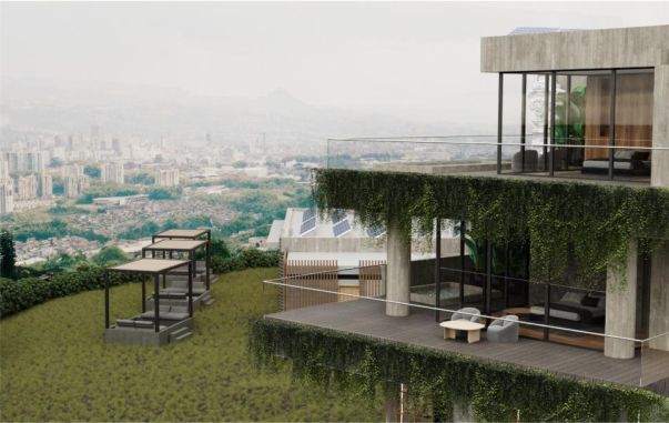 El hotel también ofrece una zona común que incluye un restaurante, un bar privado, un área para eventos con piscina y salas exteriores con chimeneas tipo fogata, todo con impresionantes vistas de la ciudad y un clima excepcional. Los huéspedes pueden disfrutar de recorridos por senderos ecológicos, así como actividades como cabalgatas y ciclismo de montaña en las cercanías del Alto del Nudo.